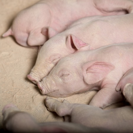 Young pigs sleeping in the barn