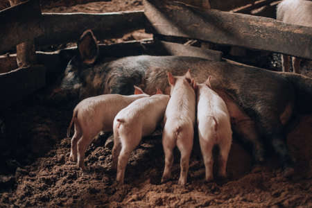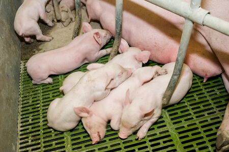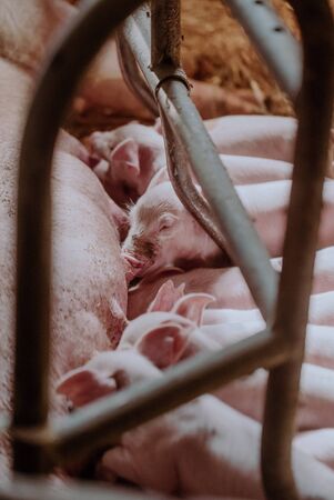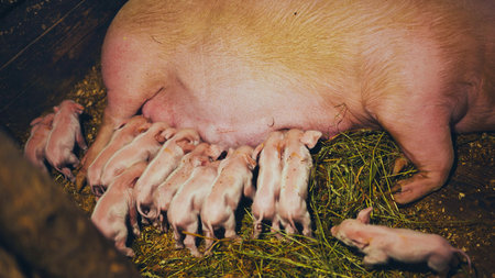 Newborn farrows eating sow's milk in the barn