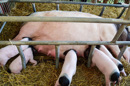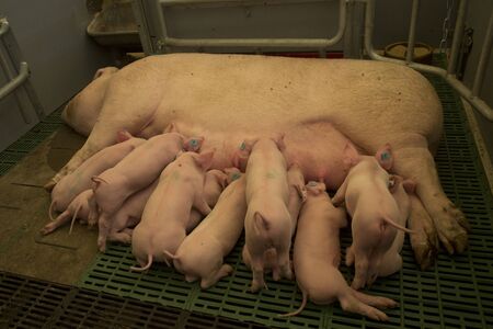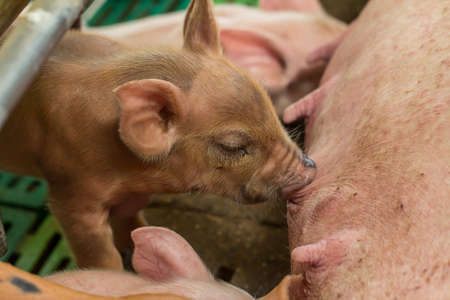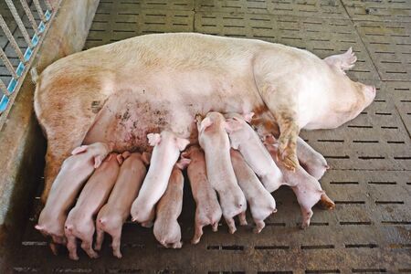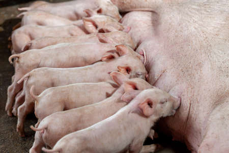 Baby pigs sucking mother pig in hog farms, animal and Pig industry