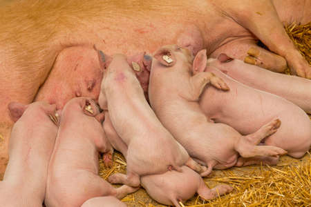Group of new born piglets sucking milk from breast of pig mother