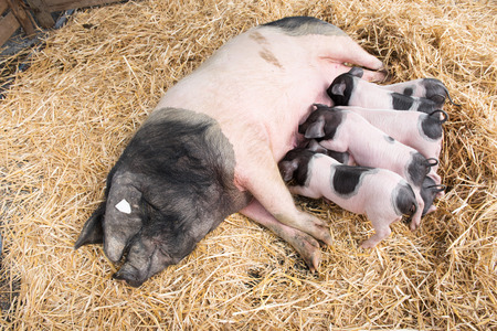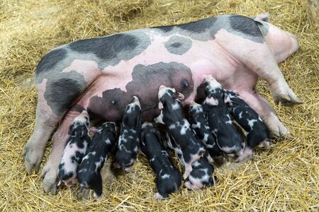 Fertile sow lying on hay and piglets suckling in barn