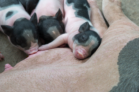 Pink and black newborn pig suck up milk from mother pig in the farm