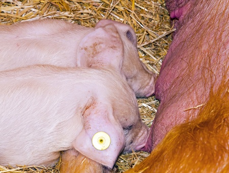 young sleeping pig after sucking in shed