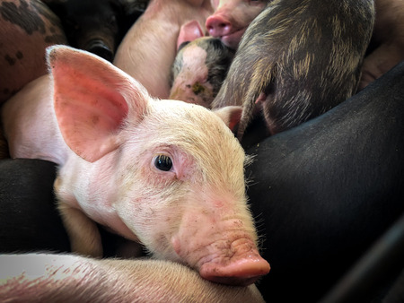 Close up Small piglet sucking milk in farm. Group of animal in farm Thailand.