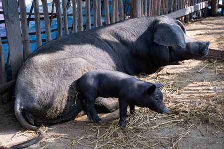 Cute baby black pig and mom pig sleeping in pigpen.