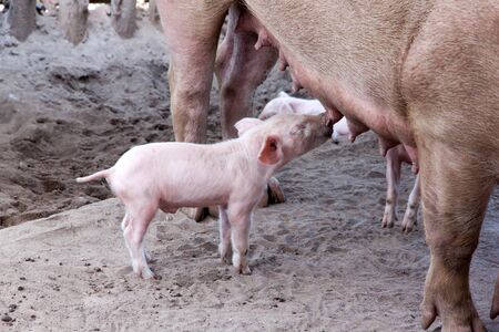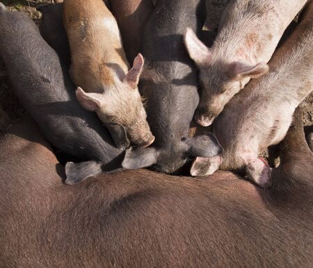 small young piglets, sucking in the open