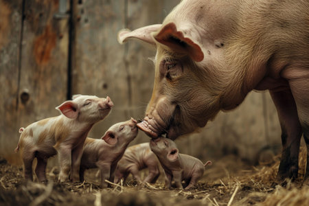 On a charming farm, a mother pig gently nuzzles her curious piglets, showing a heartwarming moment of maternal love. The playful piglets explore their surroundings with joy.
