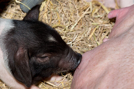 A newborn piglet is sucking milk from a mother pig