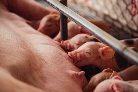 Newborn piglets nursing beside sow, highlighting maternal care in farm animal husbandry