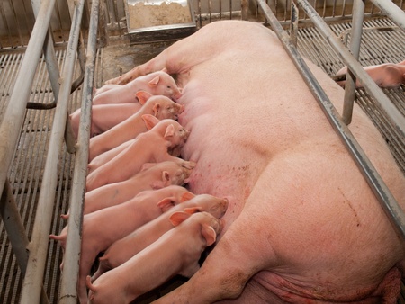 A piglet feeding from its mother in a barn, representing the pork industry market value
