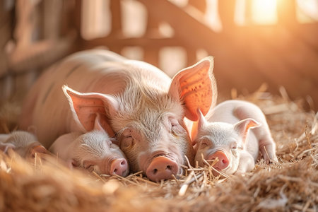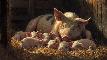 A mother pig cuddling with her piglets in a warm, cozy barn. Perfect for farm life, animal bonding, and rustic settings. Farm animals.