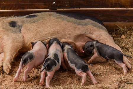 Newborn piglets suck the breasts of his mother.
