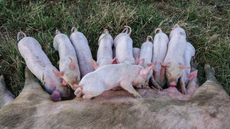 Pig mother feeds the newborn piglets with their milk. Small strong pigs suck a healthy sow. Little pigs eating milk from mother on meadow. Piglets suckling from fertile sow on summer pasture.