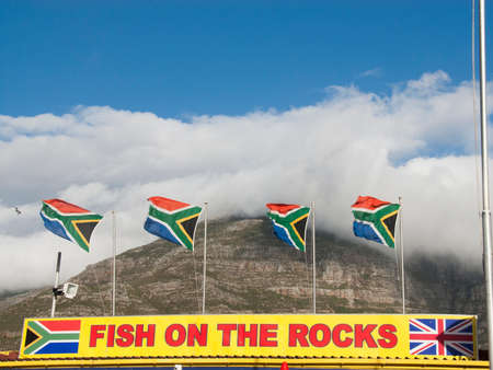 Iconic Fish on the Rocks with South African flags blowing in wind, Hout Bay, South Africa
