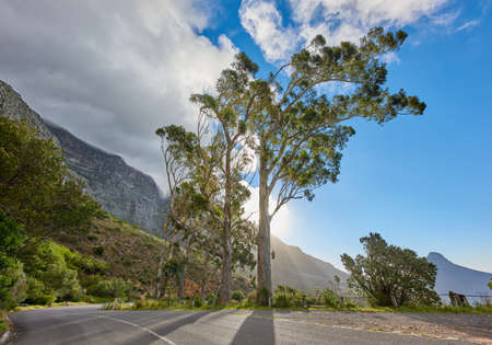 A road leading to Table mountain in Cape Town, South Africa against blue sky copy space on a sunny morning. A highway along a peaceful mountain landscape with scenic views of lush green bushes