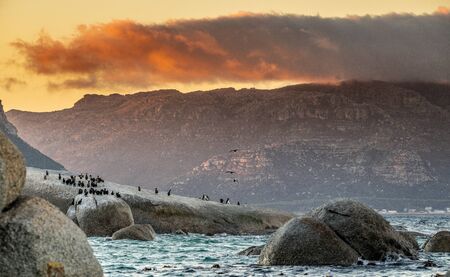 African penguins and cormorants on coast at sunset twilight. African penguin ( Spheniscus demersus) also known as the jackass penguin and black-footed penguin. Boulders colony. Cape Town. South Africa