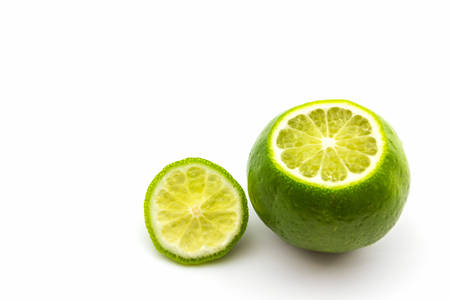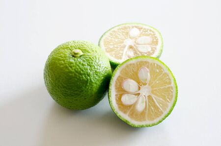 Close up of the green lime. Lime is a kind of fruit. The result is very sour for cook the Thai food style