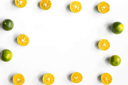 Top view, flat lay of fresh mandarin oranges on white background with copy space. Fruit composition