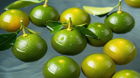 Fresh green lemons with leaves on water surface. Close up.