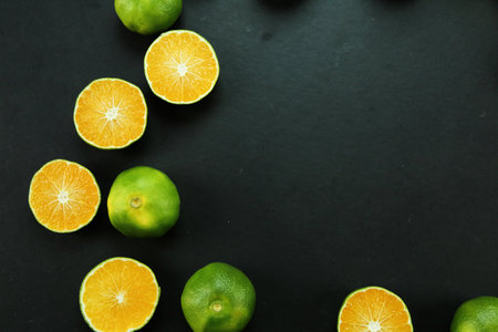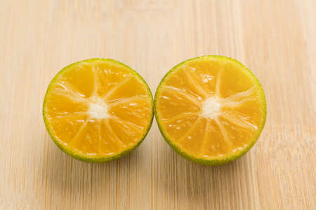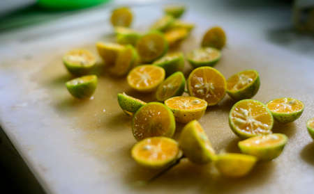 Sri Lankan variety of mandarin oranges unpeeled and cut into halves and scattered in a cutting board ready for making a fresh juice. Rich in vitamins.