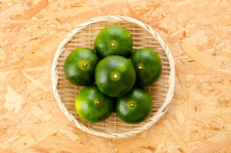 Yellowgreen Unshu-mikan(Japanese mandarin orange) on the bamboo strainer