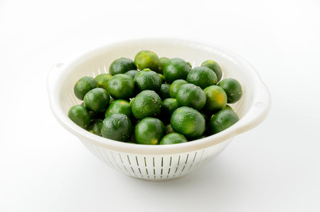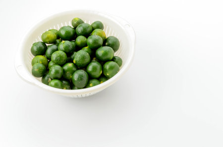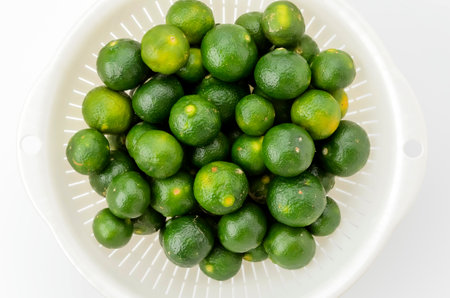 Lime fruit in white colander on white background, stock photo