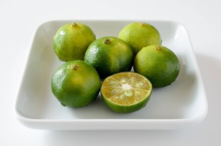 Green limes in white bowl isolated on white background with copy space.
