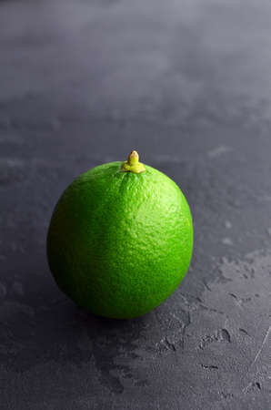 One ripe green lime fruit over black slate table background. Vegitarian food.