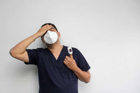 COVID-19. Exhausted Doctor looking worried as the coronavirus infected cases and death tolls rises. Emotional stressed of health workers needing support, Personal Protective gear and medical supplies.
