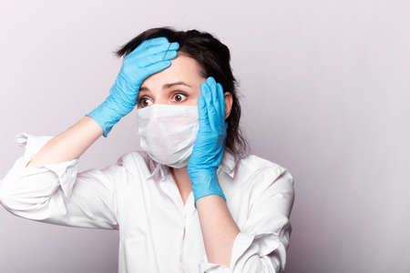 Portrait of a young woman holds hands on her head and has to stay home during quarantine due to coronavirus pandemia. Beautiful girl wearing medical mask and gloves. Covid-19 epidemia concept