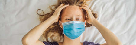 BANNER, LONG FORMAT Extremly tired young woman lying on the bed, home alone. self-isolation at home, quarantine due to pandemic COVID 19. Mental health problems in self-isolation at home