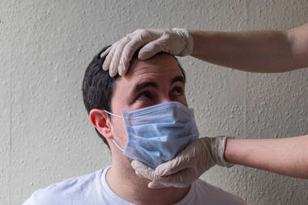 Unshaven man in a medical mask with tousled hair looking at the camera. On white background. Image toned in gloomy tones. dark, depressing.