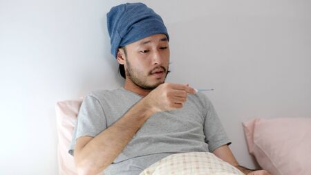 Sick asian man looking at thermometer while lying on bed at home, Flu asia male holding a digital thermometer when measures the temperature, People get fever, infection from virus check body temperature