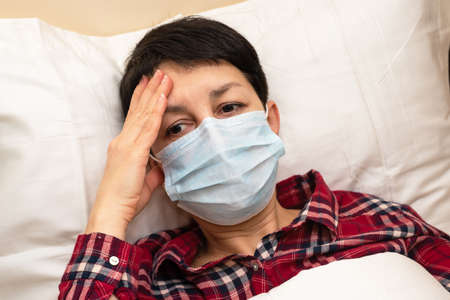 Sick middle-aged woman in medical mask lying in bed. Short-haired brunette with symptoms of covid-19 on self-isolation. Staying at home during coronavirus pandemic. Quarantine concept. Closeup