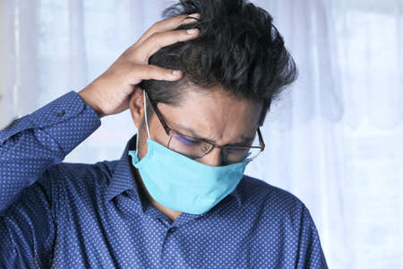 An unshaven man in a medical mask and a white T-shirt with disheveled hair tears his hair. Depression and insanity in isolation. The image is toned with a blue tint.
