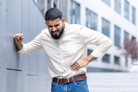 A young man stands outdoors, leaning on a wall with a pained expression, clutching his stomach possibly suffering from abdominal pain or indigestion.