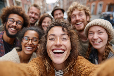 Diverse group of friends happily taking a selfie outdoors, surrounded by an urban environment, capturing moments of joy and friendship in a lively atmosphere