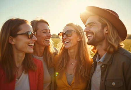 Basking in golden sunlight, a group of friends shares joyful laughter amidst the beauty of nature. Their carefree spirits reflect the happiness of their journey together.