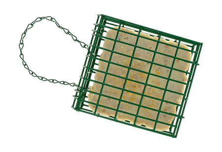 Top view of a suet basket with a cake of suet inside isolated on a white background.