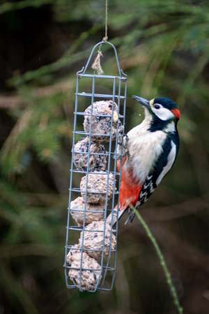 A Dendrocopos Major, Commonly known as a Greater Spotted Woodpecker, Perched on a Bird Feeder