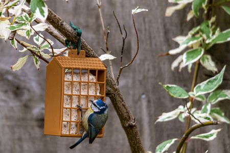 Closeup of Cute Great Tit Bird (Cyanistes Caeruleus) Hanging on Net Suet Feeder.