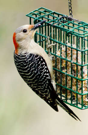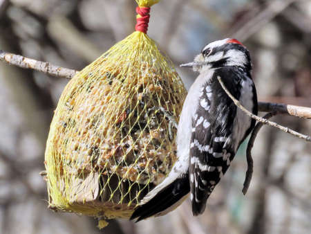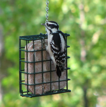 Ladder-backed woodpecker at yard suet feeder. Feeding wild birds is a common practice.