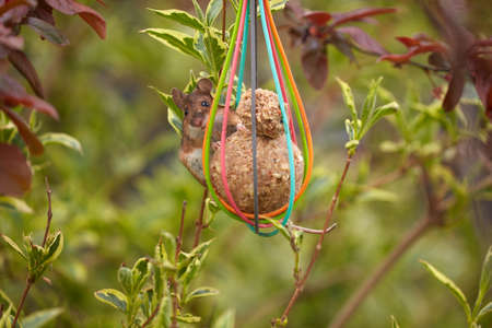 A person's hand places a bird food ball into a hanging feeder on a tree, with a red house-shaped bird feeder below, in a natural garden setting.