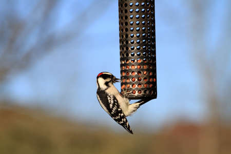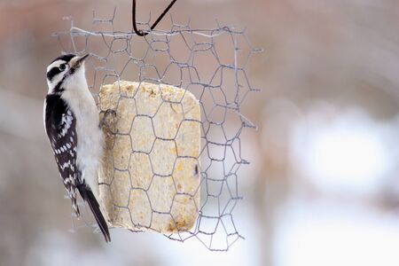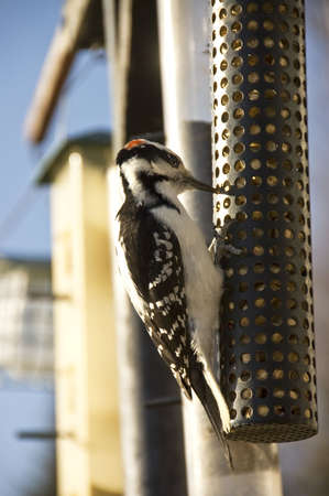 Hairy woodpecker (Picoides villosus) at the feeder in Quebec, Canada.