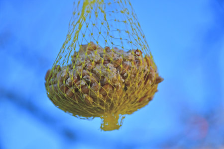 Homemade cookie made from seeds and cereals on a tree branch for the birds. Care of animals and birds during winter season. Wintertime activity for family with kids