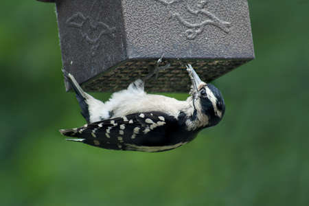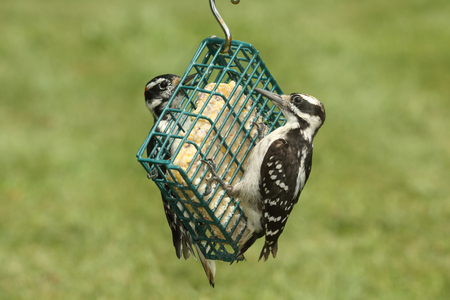 Hairy Woodpeckers (Picoides villosus) on a feeder with a green background