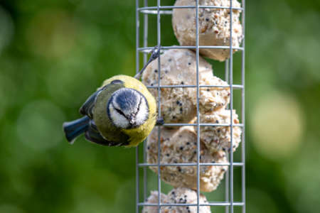 A close up of a blue tit on a bird feeder, with a shallow depth of field