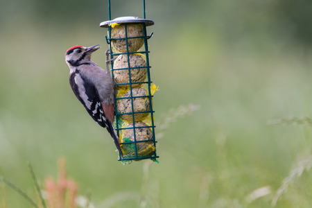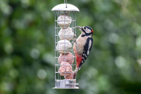 A Dendrocopos Major Eating Suet from a Garden Bird Feeder