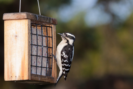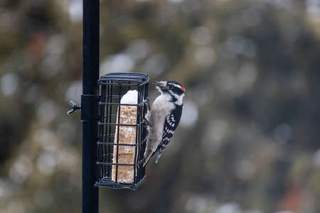 A Downy Woodpecker Feeding from the Side of a Suet Feeder