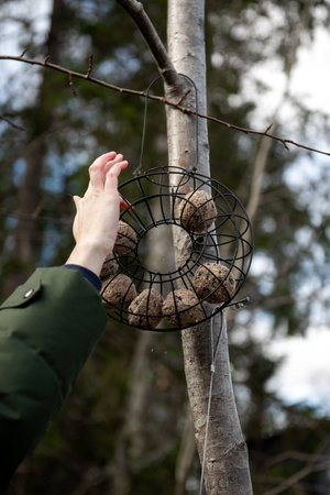 A person's hand places a bird food ball into a hanging feeder on a tree, in a natural garden setting.